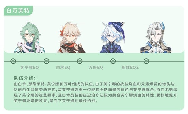 由白术、那维莱特、芙宁娜和万叶组成的队伍。由于芙宁娜的战技烧血和元素爆发的增伤与队伍内生命值变动挂钩,故芙宁娜需要一位能抬全队血量的角色与芙宁娜配合,而白术则满足了芙宁娜的这些要求,且白术战技的延迟治疗还极为契合芙宁娜烧血的特性,更快地提升芙宁娜地增伤效果,是当下芙宁娜的最佳拍档。