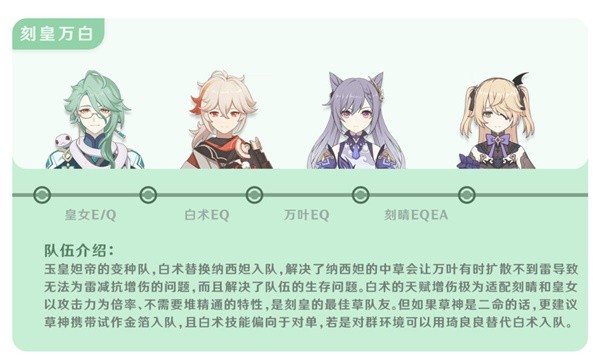 玉皇妲帝的变种队,白术替换纳西妲入队,解决了纳西妲的中草会让万叶有时扩散不到雷导致无法为雷减抗增伤的问题,而且解决了队伍的生存问题。白术的天赋增伤极为适配刻晴和皇女以攻击力为倍率、不需要堆精通的特性,是刻皇的最佳草队友。但如果草神是二命的话,更建议草神携带试作金箔入队,且白术技能偏向于对单,若是对群环境可以用琦良良替代白术入队。