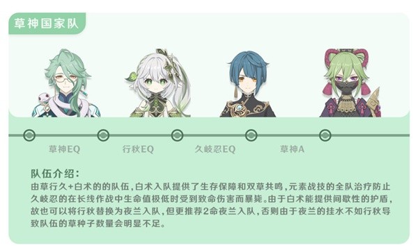 由草行久+白术的的队伍,白术入队提供了生存保障和双草共鸣,元素战技的全队治疗防止久岐忍的在长线作战中生命值极低时受到致命伤害而暴毙。由于白术能提供间歇性的护盾,故也可以将行秋替换为夜兰入队,但更推荐2命夜兰入队,否则由于夜兰的挂水不如行秋导致队伍的草种子数量会明显不足。