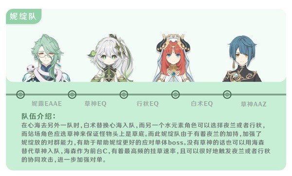 在心海去另外一队时,白术替换心海入队,而另一个水元素角色可以选择夜兰或者行秋,而站场角色应选草神来保证怪物头上是草底。而此妮绽队由于有着夜兰的加持,加强了妮绽放的对群能力,有助于帮助妮绽更好的应对单体boss。没有草神的话也可以用海森替代草神入队,海森作为前台C,有着最高频的挂草速率,且可以很好地触发夜兰或者行秋的协同攻击,进一步加强对单。