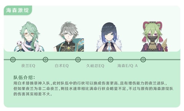 用白术替换草神入队,此时队伍中的行秋可以换成伤害更高、且有增伤能力的夜兰进队,但如果夜兰为非二命夜兰,则挂水速率相比满命行秋会略显不足,不过与原有的海森激绽队的伤害其实相差不大。
