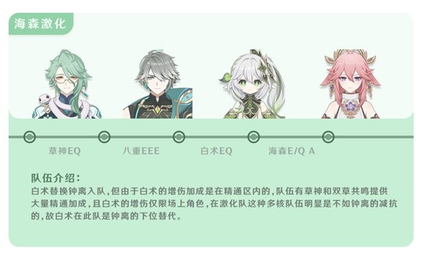 白术替换钟离入队,但由于白术的增伤加成是在精通区内的,队伍有草神和双草共鸣提供大量精通加成,且白术的增伤仅限场上角色,在激化队这种多核队伍明显是不如钟离的减抗的,故白术在此队是钟离的下位替代。