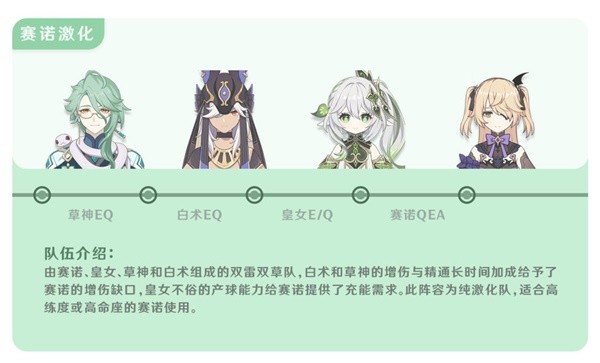 由赛诺、皇女、草神和白术组成的双雷双草队,白术和草神的增伤与精通长时间加成给予了赛诺的增伤缺口,皇女不俗的产球能力给赛诺提供了充能需求。此阵容为纯激化队,适合高练度或高命座的赛诺使用。