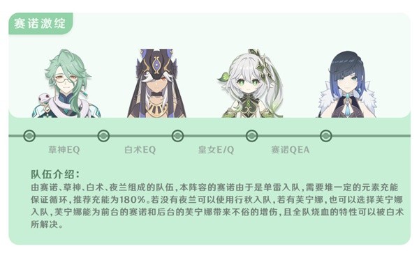 由赛诺、草神、白术、夜兰组成的队伍,本阵容的赛诺由于是单雷入队,需要堆一定的元素充能保证循环,推荐充能为180%。若没有夜兰可以使用行秋入队,若有芙宁娜,也可以选择芙宁娜入队,芙宁娜能为前台的赛诺和后台的芙宁娜带来不俗的增伤,且全队烧血的特性可以被白术所解决。