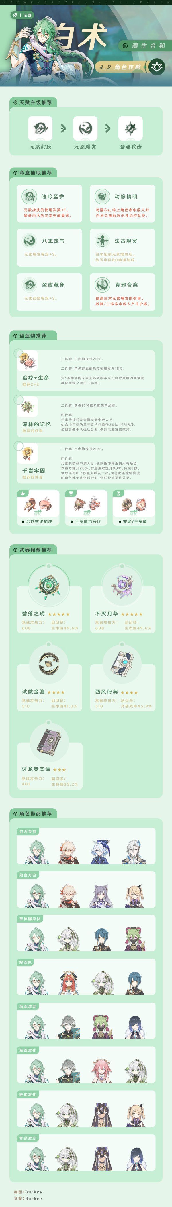 《原神》白术拥有极其的回血量及辅助能力,下面请看玩家“Burkre”带来的《原神》4.2版白术角色一图流,分享天赋升级、命座抽取、武器圣遗物选择,以及适合的角色搭配,一起看看吧!