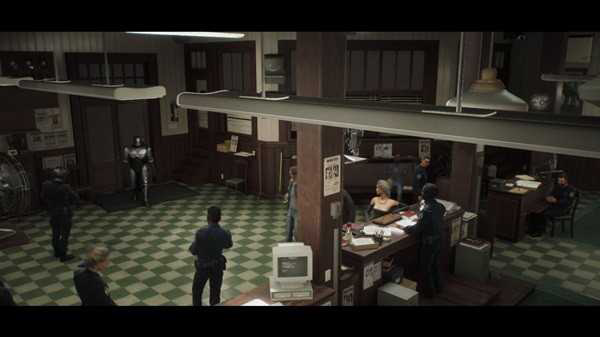 不过事实上,也许《机械战警:暴戾都市》成功的地方就在于它很好的“做旧”——我大概瞄了下《机械战警》87年和89年的两部电影,可以发现游戏中的警察局和电影中的有着非常高的相似度,甚至画面的胶片颗粒感都是如出一辙,此外游戏对于电影中的很多名场景比如巨型机器人失控杀人的还原度也非常的高,甚至你对着游戏的即时演算,再扭头看看电影的同一段镜头,也不会有多少违和感。