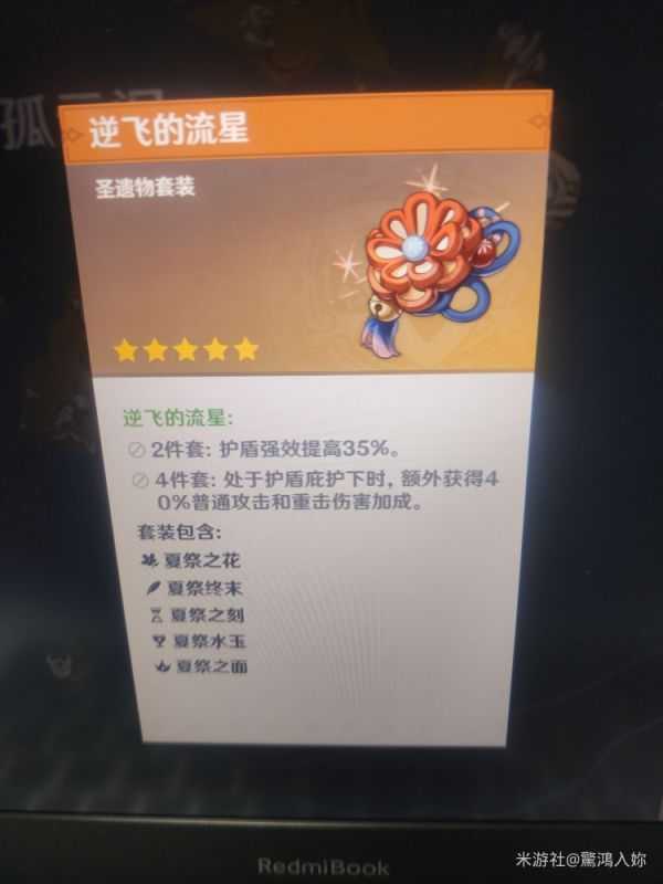 迪奥娜圣遗物(还没去刷,之前一直丢仓库),逆飞的流星4件套:处于护盾庇护下时,额外获得40%普通攻击和重击伤害加成。