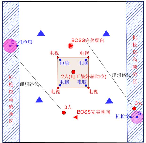 先在图下方破甲BOSS后,按路线上移即可,操控机枪塔的人迅速清怪推荐(吸血冲锋枪突脸3个人很快就清完了)。非机枪塔的3人清清非机枪塔旁边的怪就行了。中间电工丢奶奶下仇恨,如果中途仇恨变更到机枪塔侧,人员调换即可。