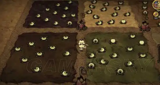 食人花会在春季随机出现在玩家经过的区域,若出现在野外,还好;若长在基地里,会导致大量资源被吃掉,所以得给基地移植地皮,防止食人花长在重要的区域