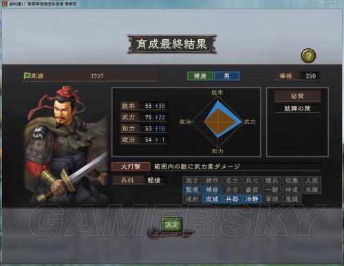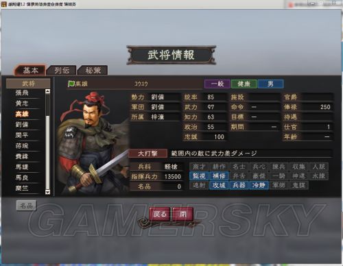 初始值:统率 55 武力 75 知力 53 政治 54