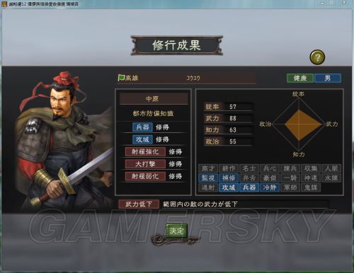 所以第一阶段练完后属性统率 57 武力 88 知力 63 政治 55(统加了2点武力加了13点,知政无视)