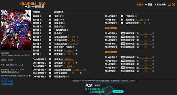 《真女神转生5复仇》是一款角色扮演类冒险游戏,玩家将在荒废的东京里进行探索,通过修改器玩家可以调整游戏中的生命值、伤害倍率等各种属性,下面请看由“风灵月影”带来的《真女神转生5复仇》修改器及使用方法,希望可以帮助到大家。