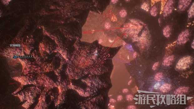 本关中的紫魔魂石碎片在第一次转向或攀爬时往右走(如下图紫色箭头所示位置),破坏血囊之后立刻就可以找到。