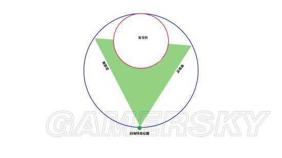 蓝白两圈的中点为轴心,观察视野线覆盖范围为边线,三角地带几乎可以囊括所有位置,所以在进圈前通过这种方向的选择,让我们尽快掌握身边敌人的动向,如果没有敌人,则以所处位置到安全圈最近距离为基准,驾车快速到达后,以车身为掩体进行布防,同时若遭遇敌人的攻击,则可以将烟雾弹铺向被打一侧,确保缩毒结束,我们依旧存活。