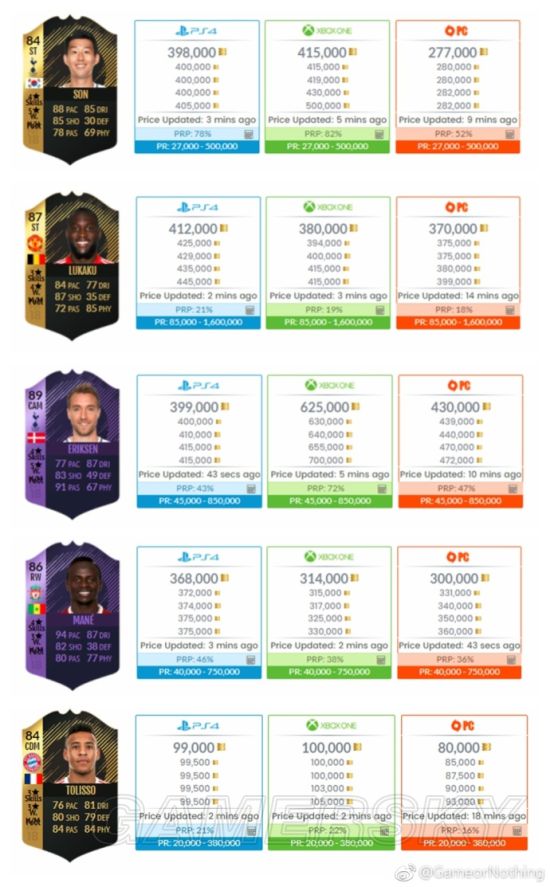 FIFA18 TOTW9: 孙兴民,卢卡库,埃里克森,马内,托里索的最新价格