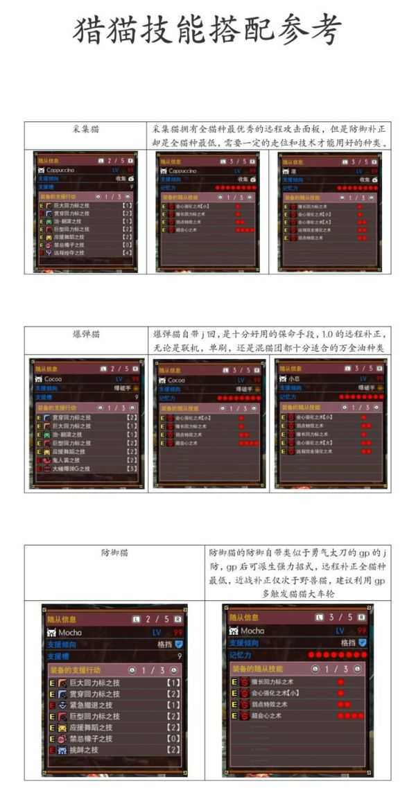 《怪物猎人XX》中猎猫种类多,且技能搭配较为繁琐,很多玩家不知道应该如何选择。下面带来由“我为猎猫带盐”分享的《怪物猎人XX》猎猫技能搭配选择参考,希望可以帮助到大家。