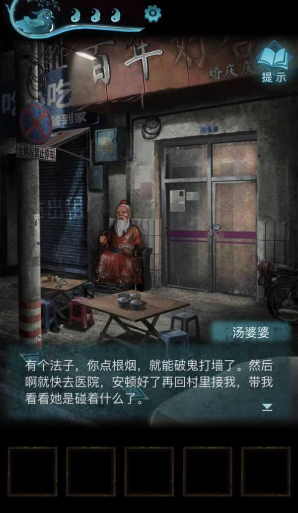 打开易寿堂得到纸手机和纸小庙,点开解梦得到信息。分别为大凶中吉大凶小凶中凶,得到一个小旗子。出来后接到二爷爷电话,挂断电话后用旗子打开百年好合的门,模特,获得红盖头,用它裹手去拉开柜子,得到喜烟。按顺序鞭炮,得到火小零件,回到益寿堂,安上调整顺序北水南火东木西金中土,得到拨浪鼓。将喜烟放在烟灰缸上,点燃,鬼打墙没破除,汤婆婆来电。得知还要靠自己哈哈哈哈,香烟烧完了,将烟灰倒进一旁的清水,把红盖头沾湿,回到易寿堂,用红盖头擦窗户,发现里面都是棺材,用手机,拍下顺序。