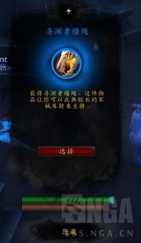 心能描述 :获得寻渊者缰绳,这件物品让你可以在典狱长的军械库骑乘坐骑