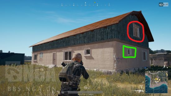 对二楼窗口(红色标记)投掷手雷或闪光,需要记住的是,一定是在有小窗(绿色标记)这一面。