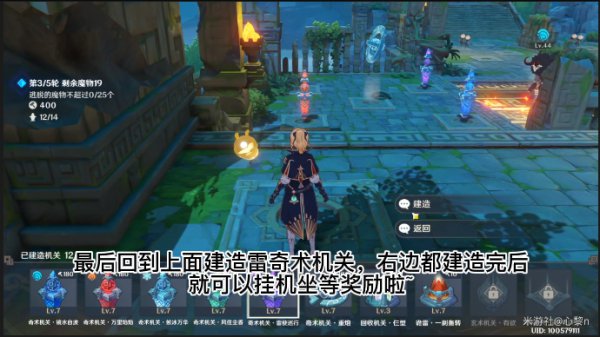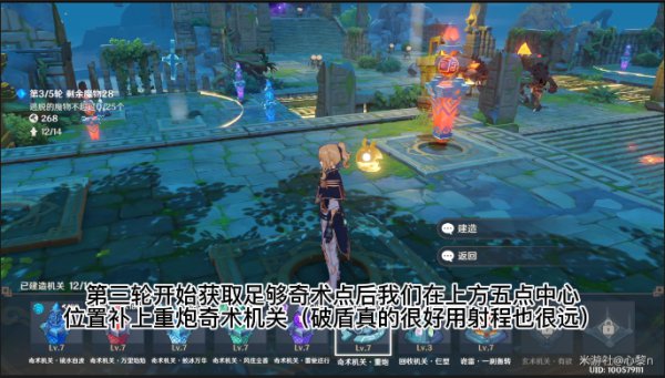 第三轮获取足够奇术点后(也就是200奇术点)我们在上方建造重炮奇术机关,左右两边各一个,以及上方火机关旁边建造雷机关,对应机关数字11,12,13,14。