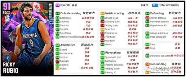 西班牙金童卢比奥,又一位来自我狼的名宿。这张卡主要的亮点在于防守端,同时兼备着不错的组织和突破能力,自带第一步大师和抢断专家金章,但进攻能力略差,而且唯一的紫章是不太实用的花式传球手,不过1米93的身高倒是很好。