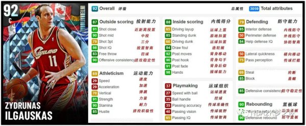 大Z伊尔戈斯塔斯一直都是2K中很抢手的空间型中锋,因为他不但身高非常突出,而且投篮包也都很顺。不过这张钻卡的三分略低,最好用钻鞋来提升一下。此外,堪比姚明的速度也是他硬伤,这点也是没办法补救了。