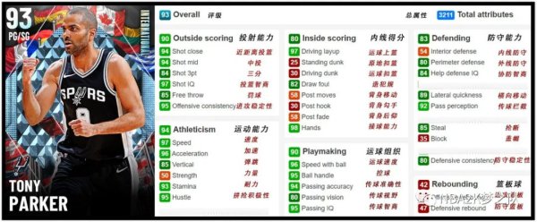 “法国小跑车”托尼·帕克又来啦,他上一张绿卡就已经给人留下了很深刻的印象,这张钻卡肯定也不会太差。其移速高达97,还拥有最实用的第一步大师和转换大师两枚紫章,一个字就是快!不过他的扣篮还是很弱,再加上1米87的身高,突进去很容易被盖帽。