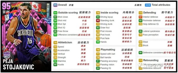 粉钻佩贾是一张非常极端的投手卡,他除了投篮属性很高之外,其它属性均低于粉钻,甚至钻石的平均水平。此外,他的徽章更是夸张,居然除了投篮章之外其它徽章都是0...而且还没有远程炮台(也不可以升级),感觉这张粉钻还不如紫汤神实用。
