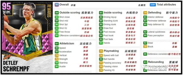 本次锁卡奖励施拉姆夫,是个不太熟悉的名字,他是第一位来到NBA的德国球员,曾经三次入选全明星。这张卡的属性分布很平均,身高也不错,没有明显的软肋,但也没有特别突出的地方,投篮包和迪奥有点相似。徽章质量尚可,但不能打第一步有点伤。总的来说,如果你不想拿JR,就没必要锁。