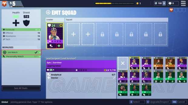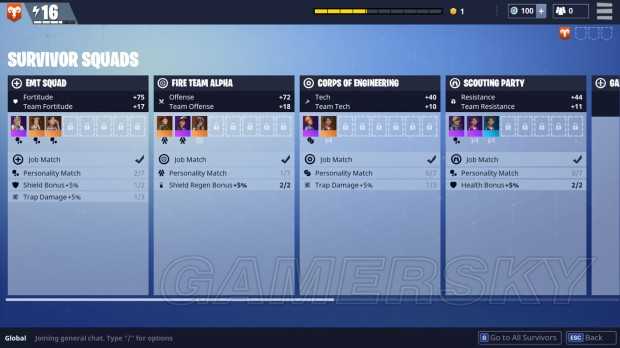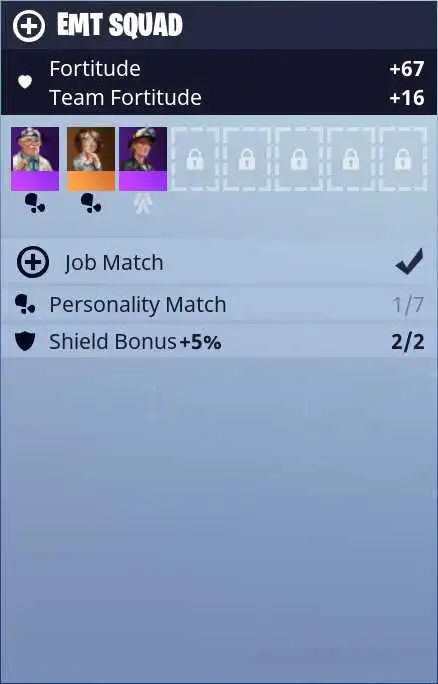 以医护小队作例子,此队伍将提高玩家血量及回血量。你的小队将需要一个生存者队长带头,它将大大影响你的素质,在图片中你可以清楚看到有一个符合当下需求工作的的生存者队长(Job Match),符合到需求时将会加倍增益,但如果你没有任何符合需求的生存者也不必担心,还是有增加你的素质,只是没有加倍来得多。