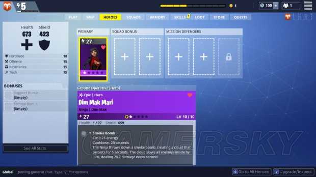 在英雄选单中,你可以选择你的主要英雄,那将会是你在游戏副本中所扮演的角色,作者在这边的范例是使用 Dim Mak Mari 这个角色,如图所示,你可以在左边区域看到该角色的F.O.R.T素质。