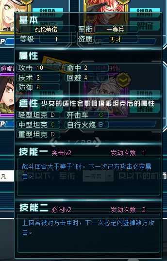 不同的少女随着进阶次数的增长,适性等级也就越高。适性高低可决定少女在对应的战车上发挥的属性,例如适性为D的少女只能发挥对应坦克的60%性能。