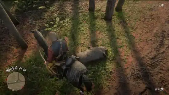 我个人习惯在红圈处扎营,然后再骑过去。一般是说如果过去没遇到就重新读档,不过我后来发现一个确认的方式。过红点继续走,在图中玩家的位置如果有看到一头猪的尸体,表示红点一定有山狮,这时候再折回去就会出现了。