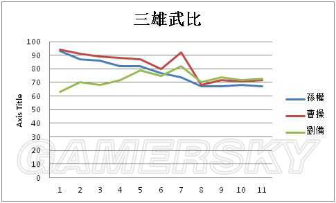 这张图标显示的是曹操、孙权、刘备三个人在十一代《三国志》中武力数值的变化曲线。可见初期曹孙强,刘备弱,然后从4代开始,前两者逐渐走低,刘逐渐走强,8代之后,格局稳定下来,形成刘、曹、孙的强弱次序。我估计是因为3代开始把统帅和武力分开,4代又加入了特技系统,为了平衡起见,只能压制曹、孙的武力,刘备虽有补偿,其实升幅也不大。