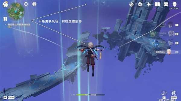 往地图的西北方向飞,不断更换风场,前往废墟顶部