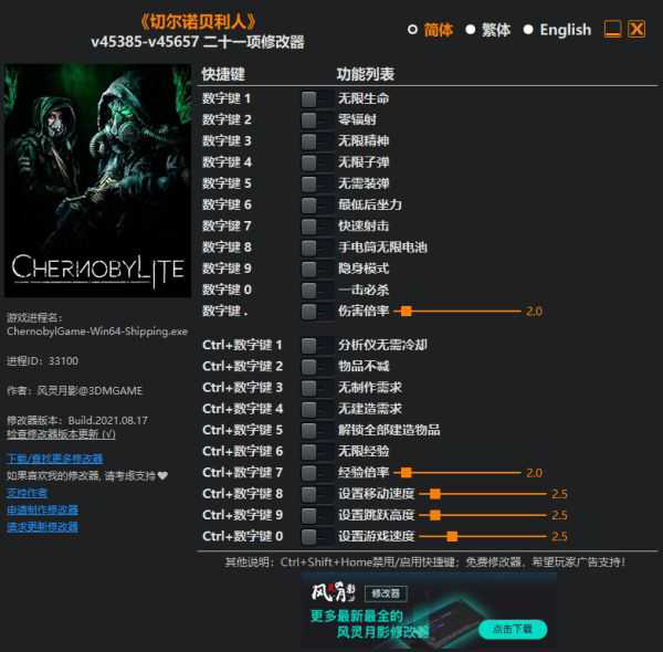简体、繁体、English,可以切换语言 (切换语言后修改器将把该语言设置为默认语言)