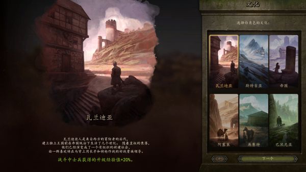 创建人物时首先面临的是种族选项,通常玩家都会在瓦兰迪亚和帝国之间二选一。帝国种族天赋是建造速度。瓦兰迪亚则是增加练兵速度。帝国的天赋由于玩家不能当总督。攻城时候一般会有专门的NPC担任工程师。所以认为帝国在竞争中并不占优,而阿塞来的天赋是贸易但是即使是创建更高档次的商队玩家建立商队也就几次,本钱也真的不是问题。增加个人贸易优势似乎也并不算重要。剩下的三个势力主要是加跑速,斯特吉亚雪地惩罚降低。条件太苛刻了。巴旦森林也太苛刻了。库赛特骑兵加速效果提升,似乎有那么点用处不过仍然不具备竞争力。所以还是瓦兰更有用一些。毕竟玩家从头到尾都要练兵,现在不能坐镇。教练技能也没啥效果。瓦兰的%20练兵速度很明显就很有用处了(不过似乎种族天赋统统都没有实装?)种族选择不光是天赋的选择,还会略微影响后面的出身属性,这里也并不是说要大家一定要选择瓦兰迪亚开局,其他的天赋同样精彩。那么如果出身选择有差异的话我的攻略不是无用功?其实我只是提供一个创建任务的思路并不是想建立一个模板。即使玩家想要创造其他种族的角色,本篇同样具有参考价值~然而不选择一个种族的话就没办法继续了,所以本篇以瓦兰迪亚开始。