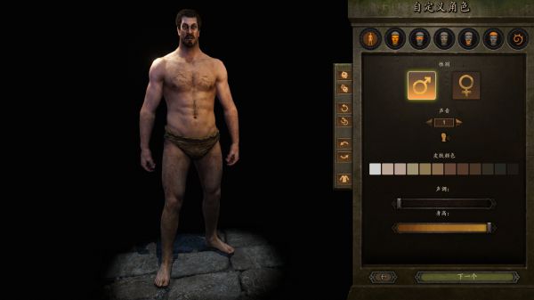 出身选择完成后下一步就是身体外观的基本信息选择。最主要就是第一页的身高。很多玩家可能会认为娇小型的比较不容易命中,但是实际使用中我发现,娇小型其实并不具优势,我想反玩家标枪,贫铀石子,精准制导弓弩很多玩家都尝过吧,介于电脑人均狙击手。所以我通常喜欢把身高拉到最高。因为个子高的话。砍人视野好很多。所以还是大个子更有优势。当然也不是一定要猛男型,喜欢娇小型的玩家创建娇小角色也没什么关系的。声调长相什么的。就自由选择就行了。毕竟糙汉子外观又能有什么花样呢。(其实女性角色也没什么抢救余地,毕竟骑砍10年人均貂蝉)