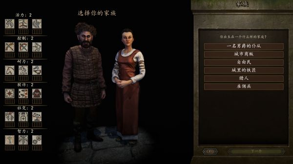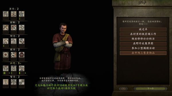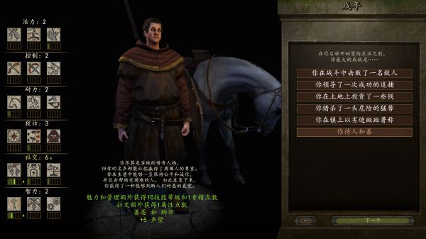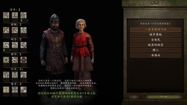 在第一项出身选择中增加社交和智力的选项是男爵仆从和城市商贩,各加一点社交或智力。看起来城市商贩的魅力和交易都是推荐技能中的选项,但是男爵仆从增加的骑术和长柄也算有用的技能。我通常会推荐骑术至少2点来骑战马所以出身中的一点骑术并不算浪费,而1点长柄武器可以点出第一级的生命值上限天赋,并且我想长偃月刀,逆刃刀是绝大多数玩家会选择的武器吧(骑枪当然也是长柄啦)。而且男爵仆从在后续选择中会出现更好的选项。