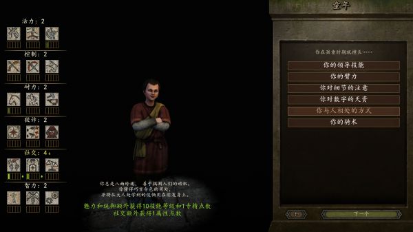第二项童年时期增加智力或者社交的选项是数字敏感和相处方式。但是数字天赋增加了一点工程学技能,游戏中玩家不能担任总督,攻城可以使用专门的NPC担任工程师,所以工程学被认为是一项不重要的技能。因此推荐选择相处方式,统御明显比工程重要的多,而魅力跟交易的地位差不多。