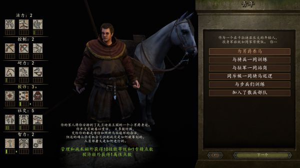 第四项青年时期。这一项同样也是受到第一项影响的。如果你不是贵族出身的话不会有养马选项跟骑兵训练选项。在这里任何选择都不会增加智力或者社交技能。但是为男爵养马。可以增加第二梯队技能的狡诈属性以及一点管理和战术。基本都是有用的选项。所以原则上推荐养马。骑兵出身增加骑术和长柄,耐力。不玩无双的话近战武器点出第一项增加生命值就行了两点长柄没有意义,所以骑兵不推荐。斥候的话有点用处。因为一般来说不想极端骑射无双流的话推荐也就60骑术能骑战马就行了。所以。斥候的弓箭和一点骑术也算有用。但是增加的1点活力有些浪费他不能帮你节省出必须点在骑术上的一个技能点,而且对跑动的加成也不大,而且即使想要跑的快一点的话直接点跑动技能就够了,基础属性如此珍贵,用属性点换技能点肯定够是不划算的。所以当个弼马温挺好。