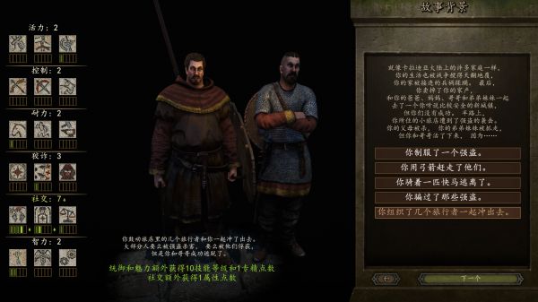 到这里出身就选完了。总共有七社交,3狡诈,我们增加了4点魅力,我认为7社交的基础上魅力只需要2点就足够了,不过出身选择不可避免的还是增加了4魅力。虽然我们并没有增加第一梯队的基础属性智力但是我们成功的把社交点到了7点,因此当前等级和技能框架下在后面的游戏中通常玩家可以升级到20级出头,按照玩家能够升级到20级来算,可以获得基础属性5点和20点技能点,5点基础属只要全部加给智力就能让智力到达7点使得管理可以达到275.然后剩下的20点技能点数毋庸置疑的要分配给管理和统御各3点,推荐再分配给骑术1点让玩家可以骑上60骑术的战马,剩下的13点技能点可以分配给第二梯队中的战术,交易,和流氓,3项可以正好全部点满,或者分配出3点技能给单手,双手,和弓箭,单双手是为了点出第一项天赋来增加生命值,弓箭则是为了使用骑射天赋前的最强骑射武器草原战弓,或者十分喜欢骑射的玩家也可以放弃近战武器,或从3项辅助技能中挤出技能点分配给弓箭来点出骑射技能。嫌弃步行慢的玩家同样可以挤出技能点在跑动上面,其余的玩法则有待玩家自己摸索。其实当前的技能系统有很多不足,所以官方正在重做,个人理解认为,流氓和战术系统不是团队技能,所以需要玩家自己点出和基础属性给的太少,或者说的等级瓶颈来的太早是当前技能系统的症结所在。更改技能的生效条件到团队上或者降低门槛,提升等级瓶颈的上限似乎都是不错的改变方式。但是目前我们担心似乎也没有什么用处,还是等待官方的正式技能系统上线吧。