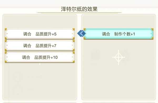 泽特尔纸默认的奖励属性:属性一 调和品质提升 属性二 制作个数+1