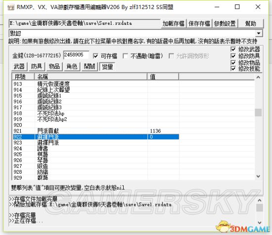 5.用RMXP修改存档,在变量中序号2228-2233是修改天赋点数的。