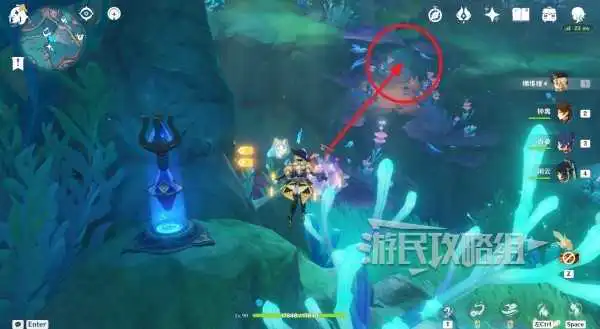 如果没有解锁附近传送锚点的话可以使用斯库拉召唤激流快速前往。传送到旧日之海谐律院传送锚点。正对的方向就是洞口位置,进入洞口沿路一直走到尽头。