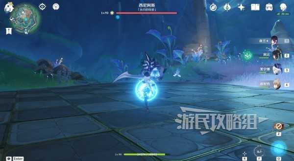 西尼阿斯就在中间的平台上,建议携带火元素角色、岩元素角色、护盾角色。不要带水系角色。