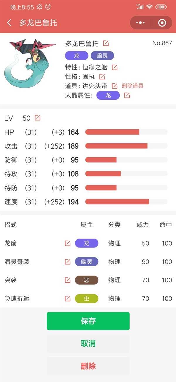 首先是队伍核心多龙,252攻击252速度6HP,一般直接开局太晶龙点龙箭输出,输出非常暴力,基本上物耐低/不抗龙直接大残。