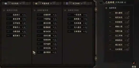 开局特质点出增加臂力,开天工物(增加锻造资质),还有天才地宝(开局送3品材料),别的看喜好就行,初始人物勇壮大于40就行,要使用逆练鱼肠剑法。