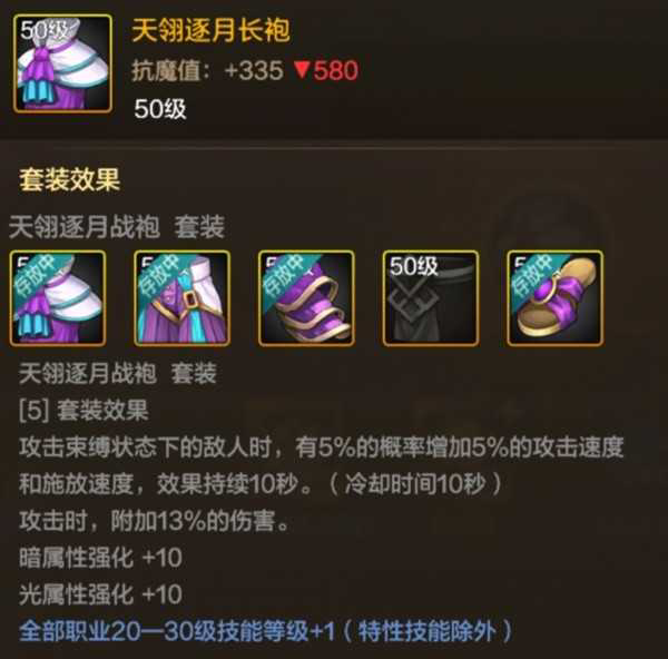 天翎逐月套装可以提供13%附加伤害,10点光暗属性强化和20-30级技能等级+1。