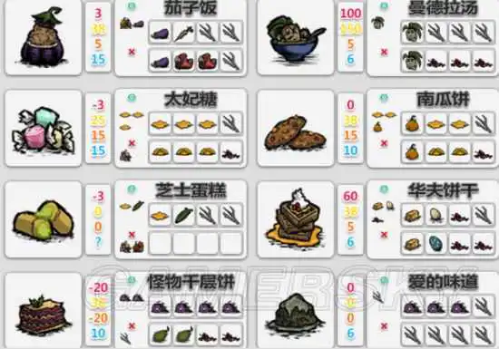 烹饪锅烹饪出什么东西看的主要是:特殊物品,各种物品的“度”,特殊物品会在食谱中介绍,食谱有优先级,例如有的菜类食物中不能加肉,以下是一些食物: